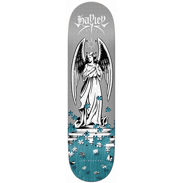 Get out and skate with the Real Hayley In Pieces TRUE FIT Deck 8.25 x 31.5. Made with DLX True Fit Mold for skaters who prefer a slightly shorter length and wheelbase while still maintaining proper hole placements and proportions relative to deck length. This pro quality skateboard deck is constructed from traditional 7-ply Hard Rock Sugar Maple wood that is held together with glue specifically formulated for skate decks. Top stains may differ from what is pictured.