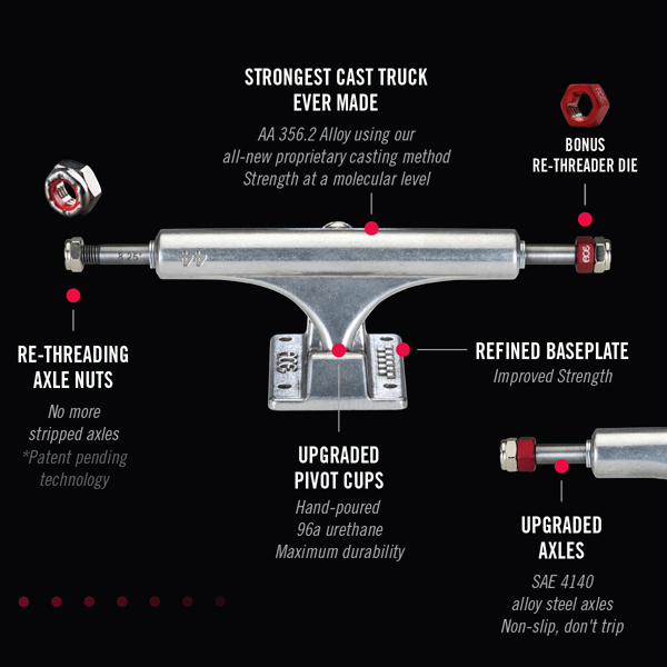 The all-new ACE AF1 features game-changing performance without deviating from ouroriginalAce geometry. The AF1is carefullymanufactured usingourproprietary casting process.Yearsin development, the ACE AF1 has a 70% increase in the aluminum’s structural integrity,making it the strongest cast truck onthe market.We updated the sizing on the 44 thru77modelsfor a better fit across multiple board widths.The Ace AF1, tomorrow’s technology today!
