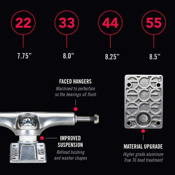 The all-new ACE AF1 features game-changing performance without deviating from ouroriginalAce geometry. The AF1is carefullymanufactured usingourproprietary casting process.Yearsin development, the ACE AF1 has a 70% increase in the aluminum’s structural integrity,making it the strongest cast truck onthe market.We updated the sizing on the 44 thru77modelsfor a better fit across multiple board widths.The Ace AF1, tomorrow’s technology today!